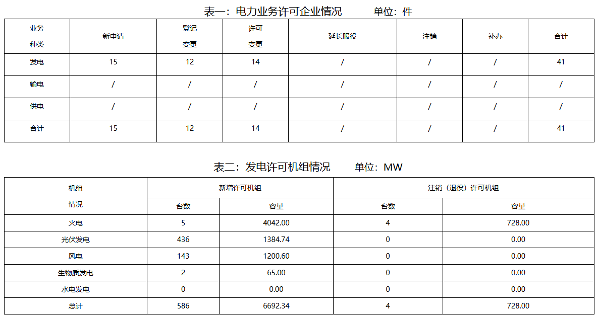 截至2月28日,全省办理电力业务许可共41件。均为发电类电力业务许可,新申请15件,登记事项变更12件,许可变更14件。新增发电装机586台(发电单元)总容量6692.34MW。其中,火电4042.00MW、光伏发电1384.74MW、风电1200.60MW、生物质发电65.00MW。