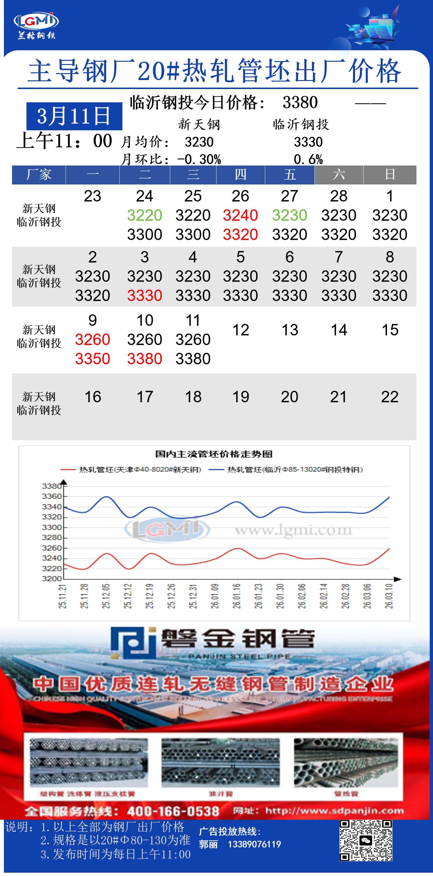 • 3月11日(11:00)主导钢厂20#热轧管坯出厂价