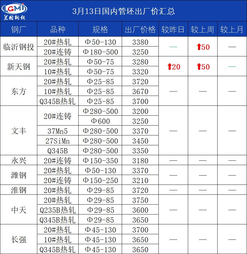 • 3月13日(11:00)主导钢厂20#热轧管坯出厂价