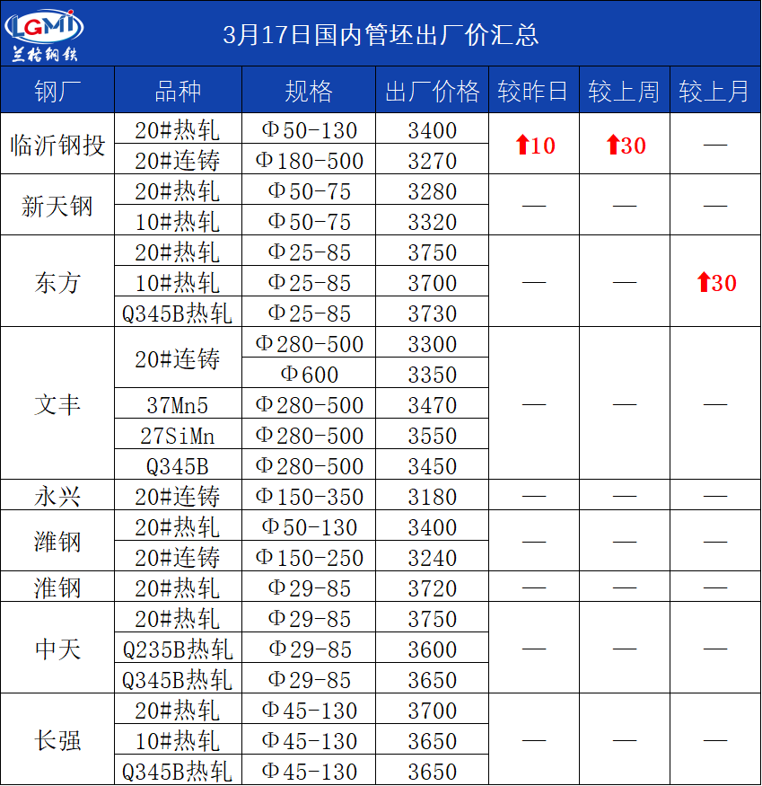 • 3月17日(11:00)主导钢厂20#热轧管坯出厂价