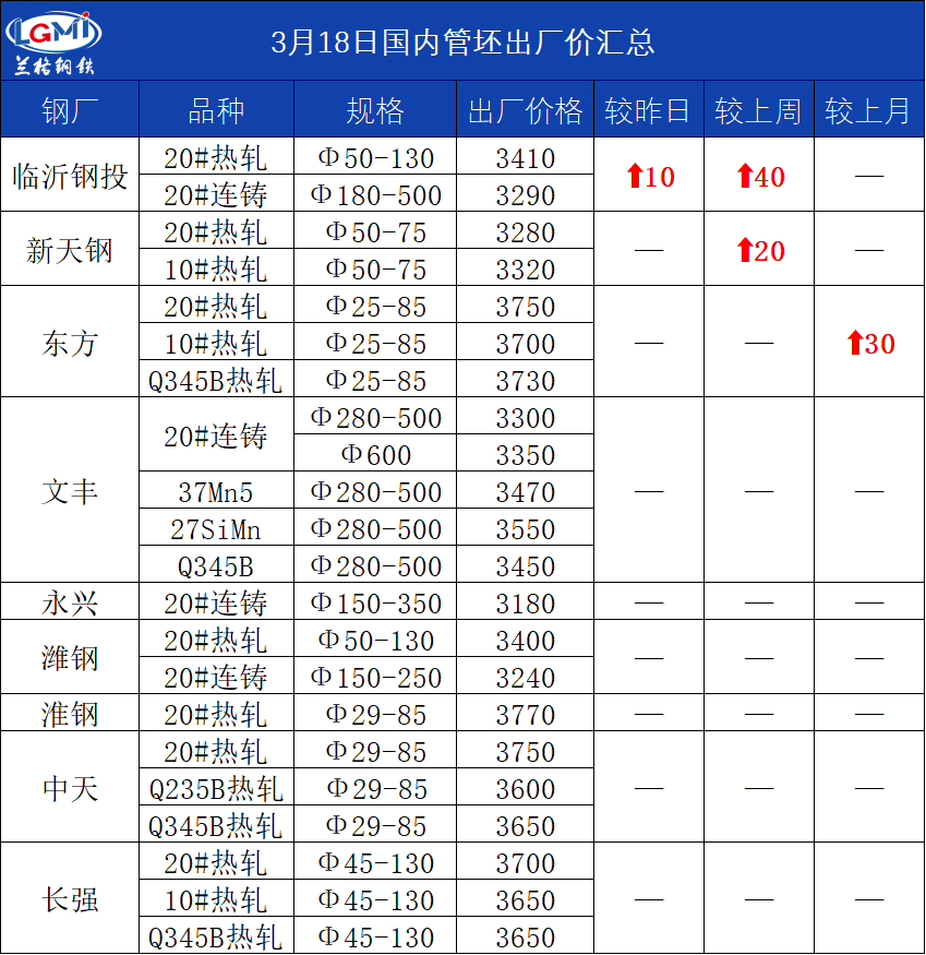 • 3月18日国内管坯出厂价汇总