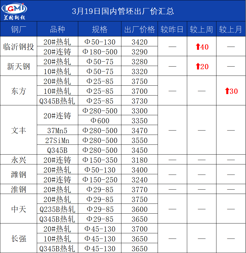 • 3月19日(11:00)主导钢厂20#热轧管坯出厂价