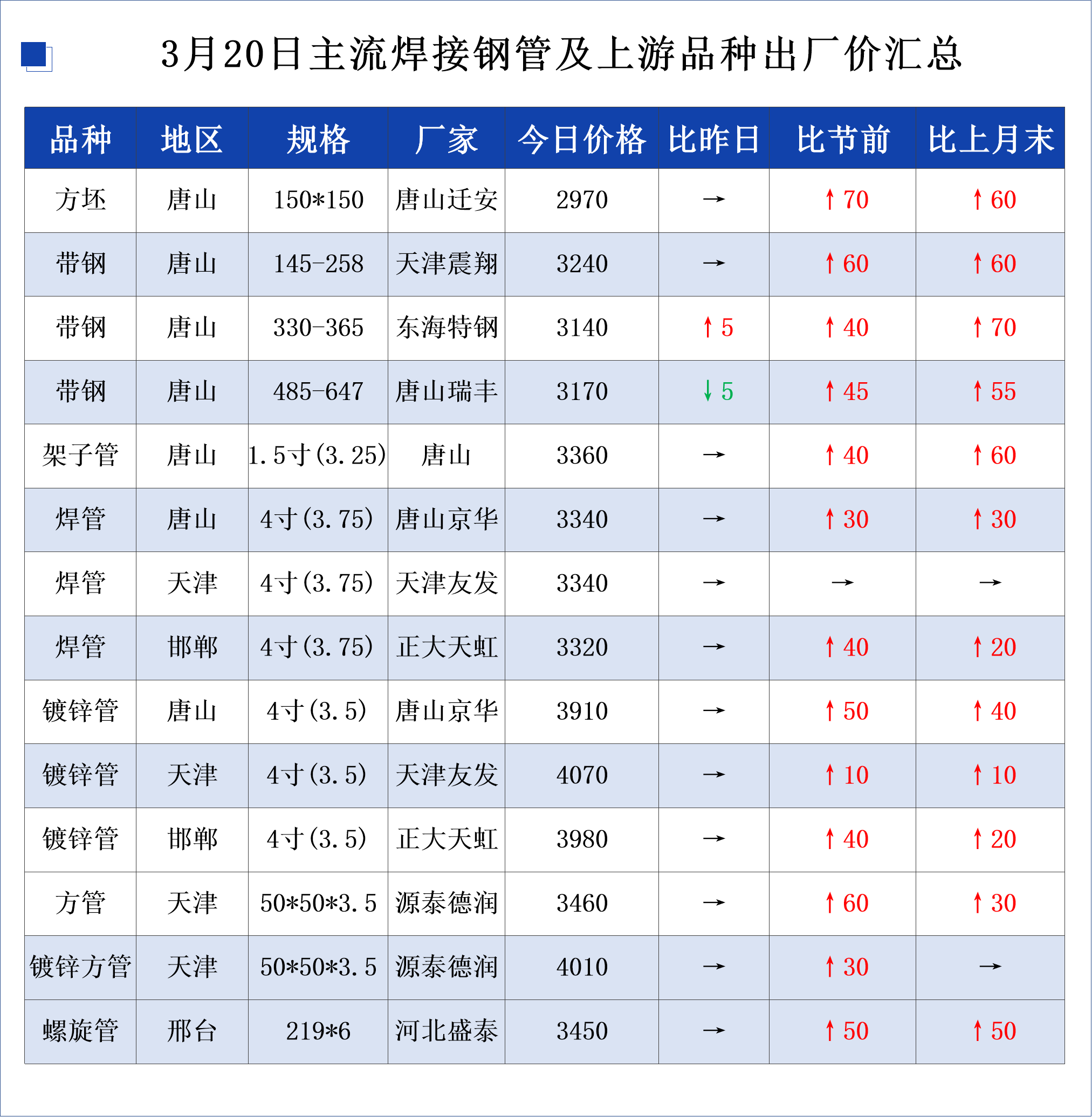 3月20日春节后主流焊接钢管及上游出厂价变动汇总