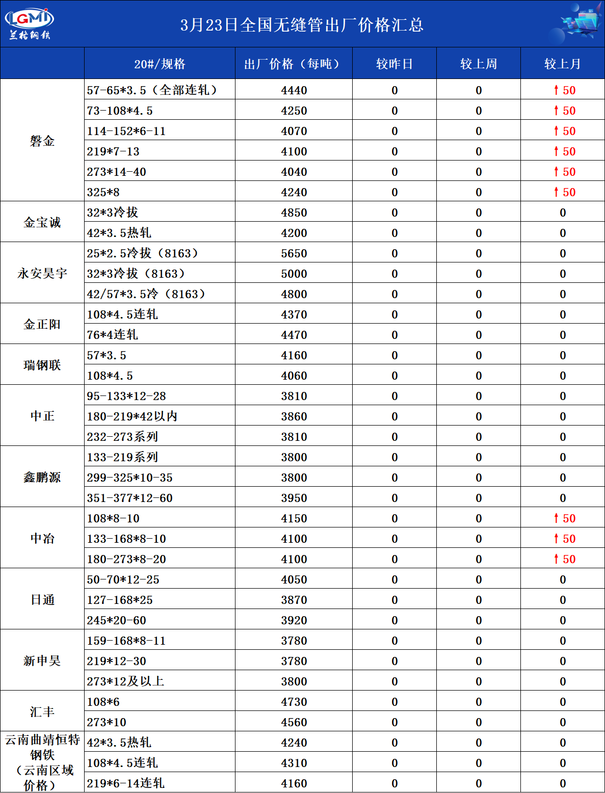 3月23日全国无缝管出厂价格汇总