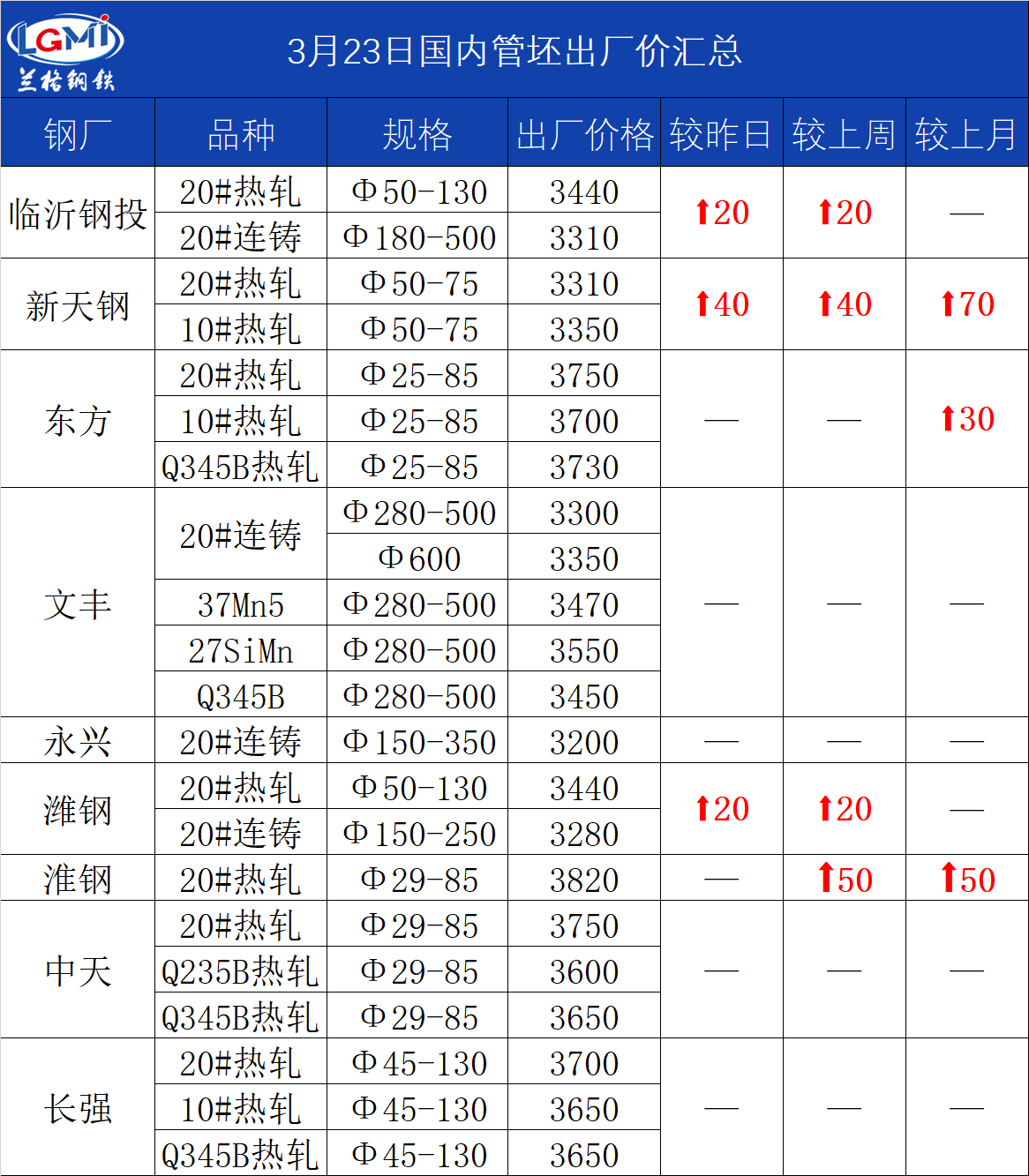 • 3月23日(11:00)主导钢厂20#热轧管坯出厂价