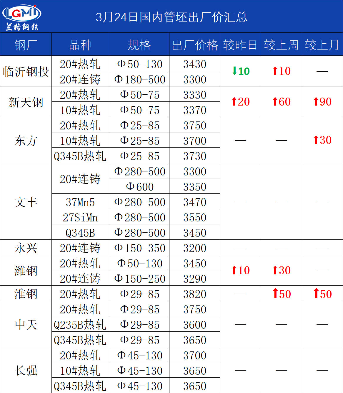 3月24日国内管坯出厂价汇总