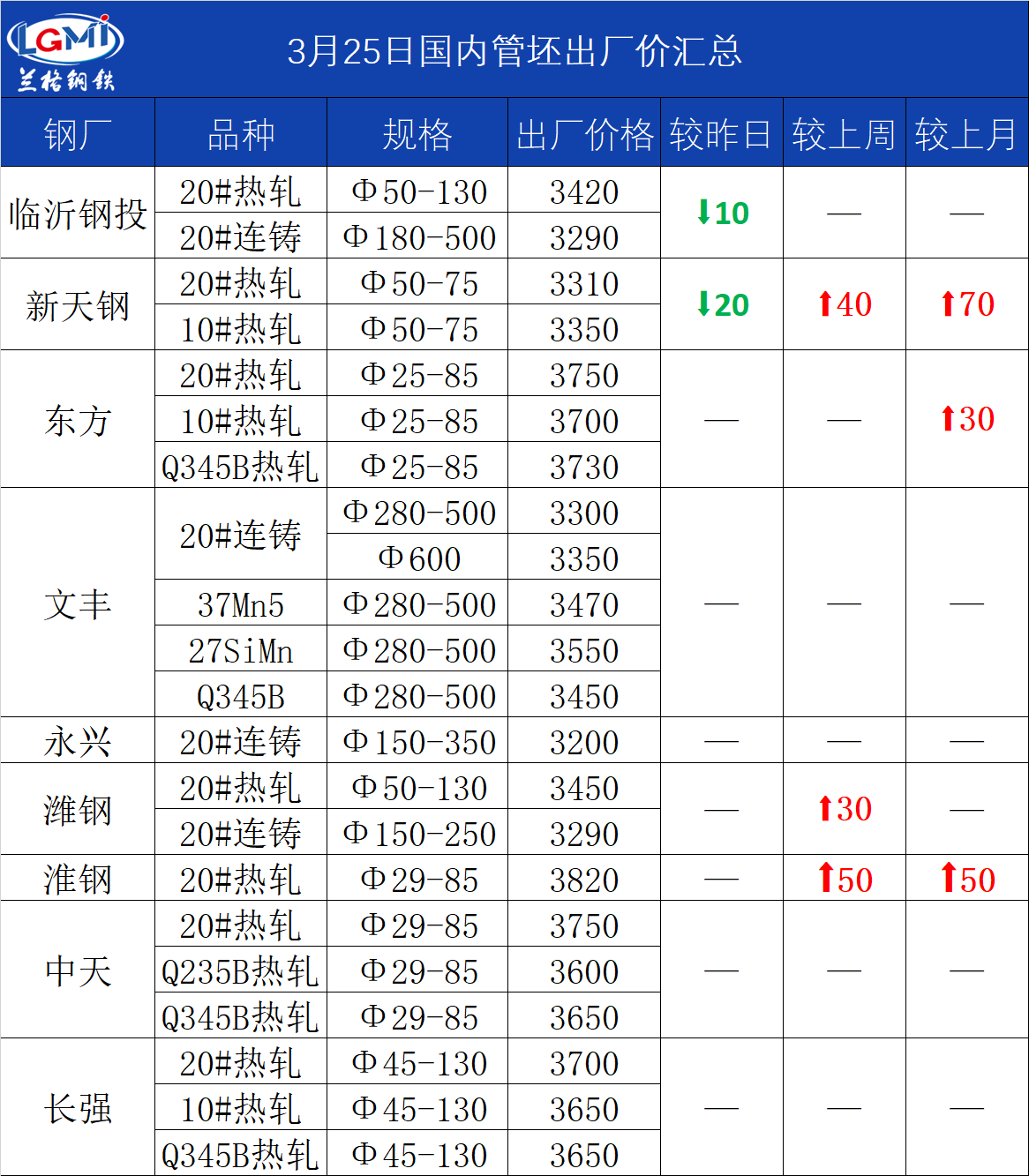 • 3月25日(11:00)主导钢厂20#热轧管坯出厂价