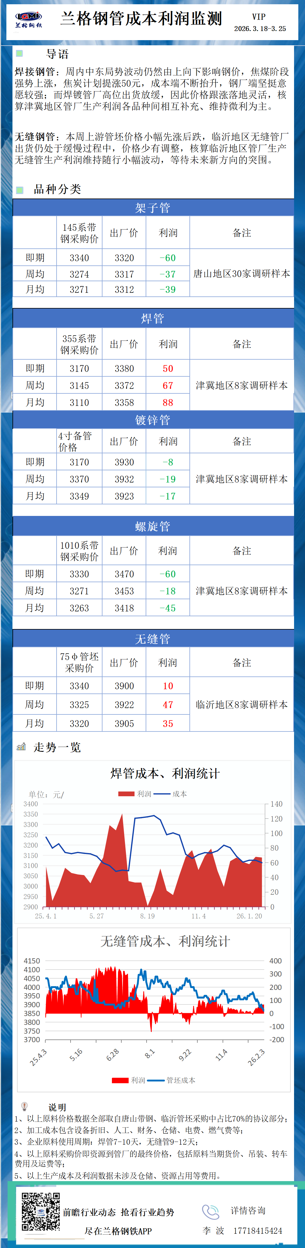 兰格调研:钢管成本利润监测(3月25日)