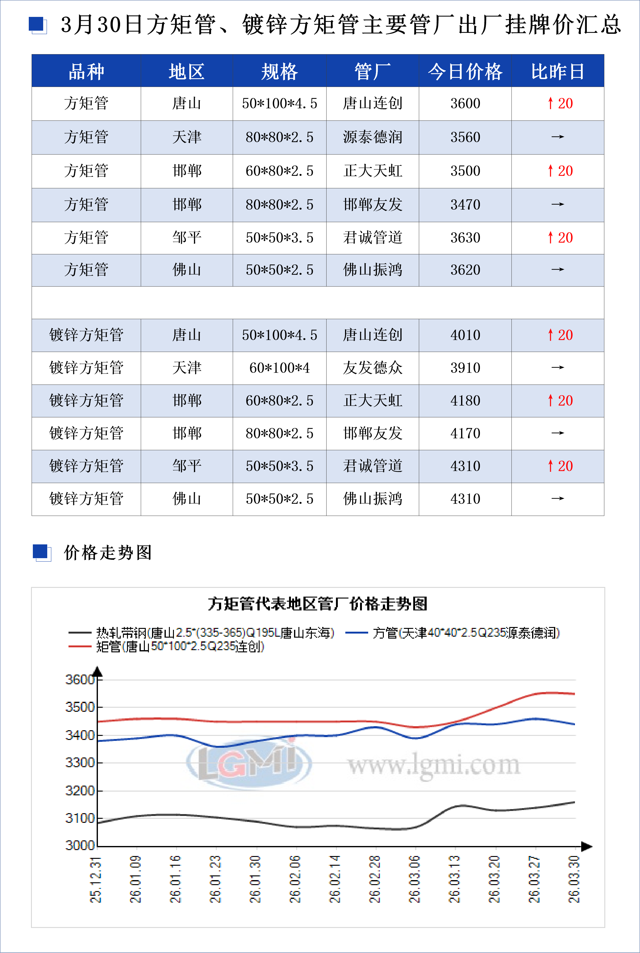 • 3月30日方矩管、镀锌方矩管主要管厂出厂挂牌价汇总