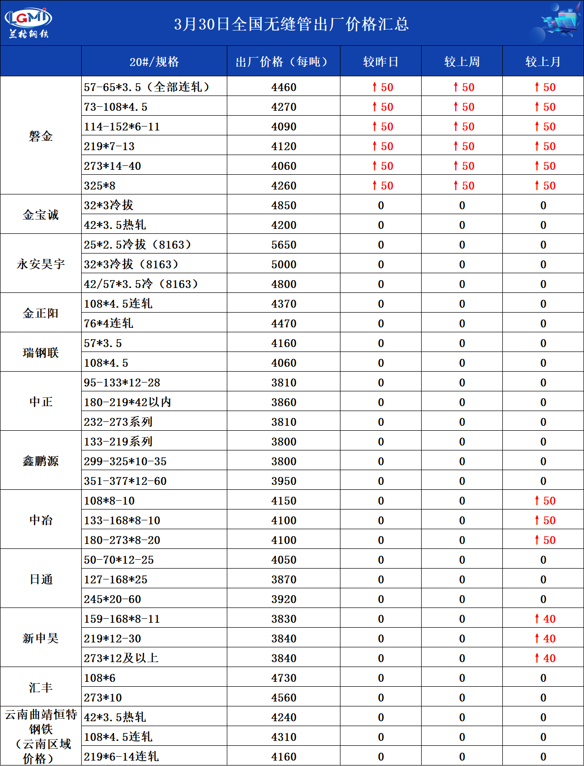 • 3月30日全国无缝管出厂价格汇总
