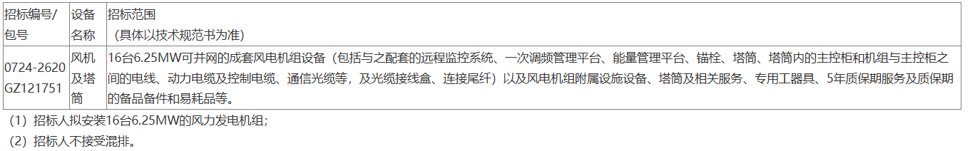7、本项目工程暂定进度计划:首批风力发电机组交货数量不低于6套,其中第一批塔筒、风机交货日期暂定为2026年9月30日。(详细要求见招标技术文件)该计划为暂定计划,最终交货期以招标人书面正式通知为准。投标人应满足招标人初步拟定的交货期,并提供自己的交货进度具体方案。