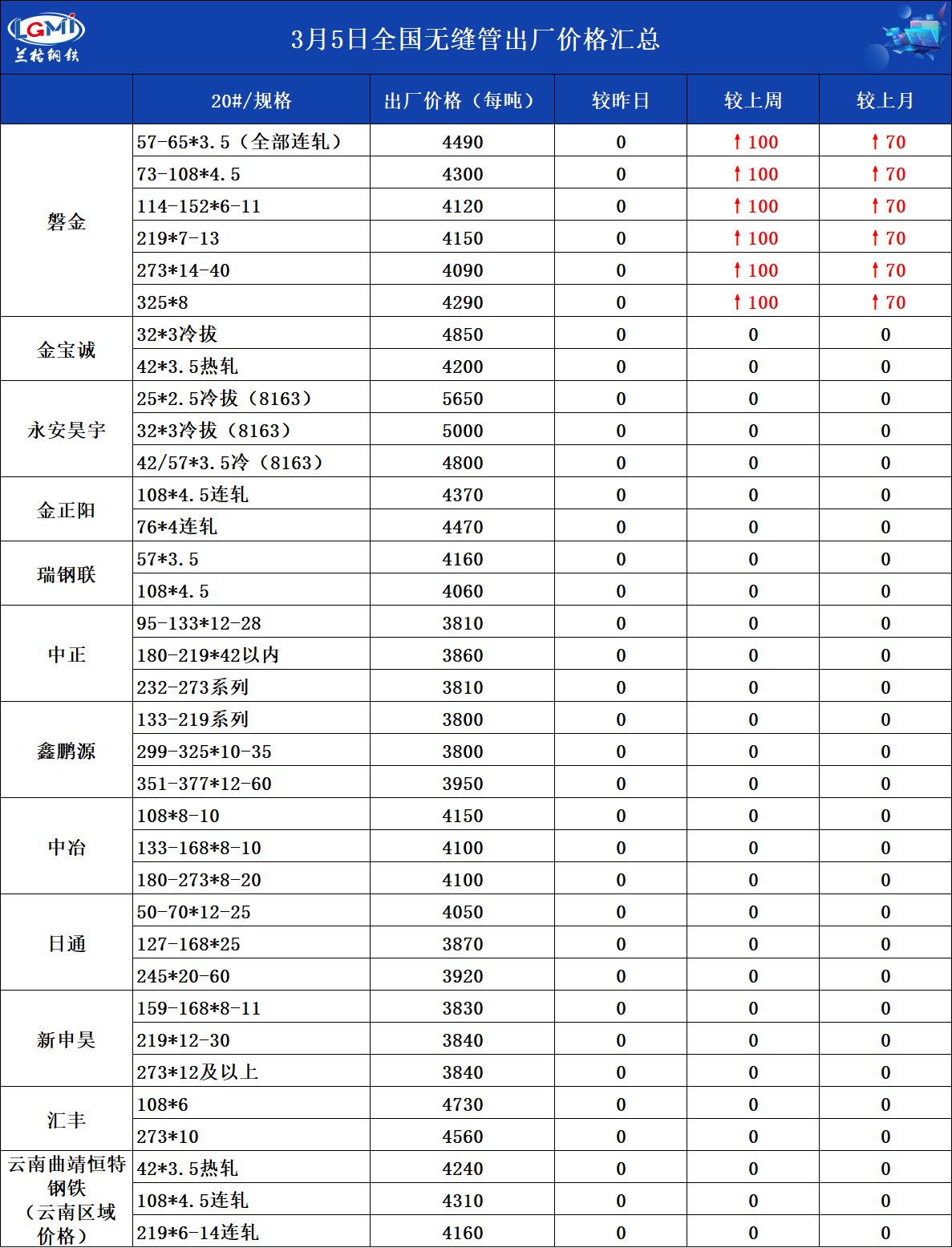3月5日全国无缝管出厂价格汇总