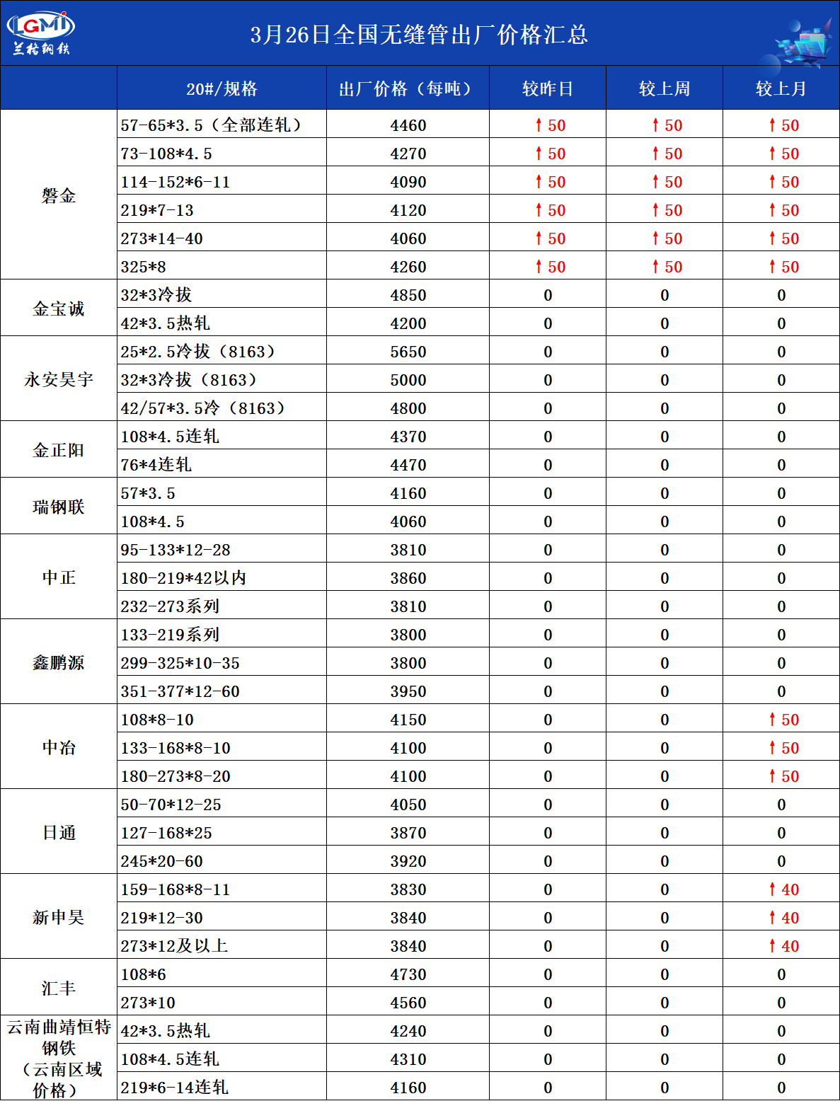 3月26日全国无缝管出厂价格汇总
