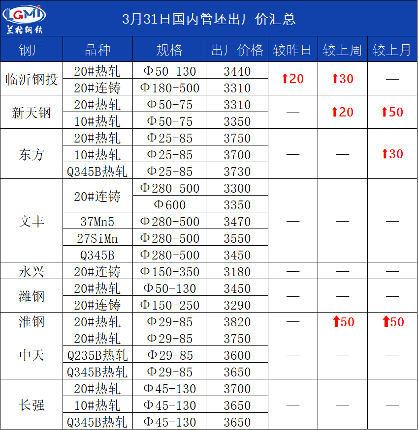 3月31日国内管坯出厂价汇总