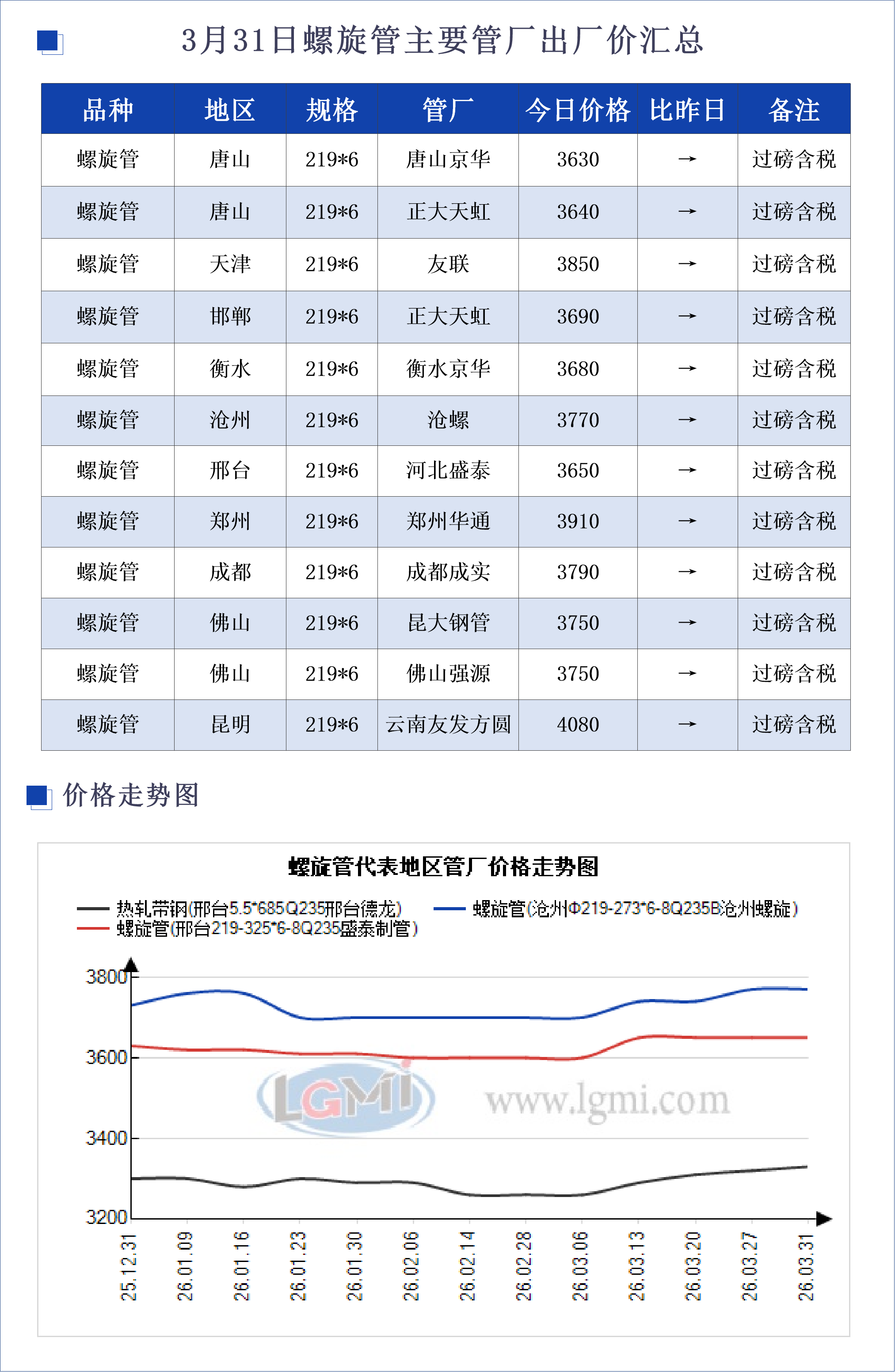 • 3月31日螺旋管主要地区管厂出厂价汇总