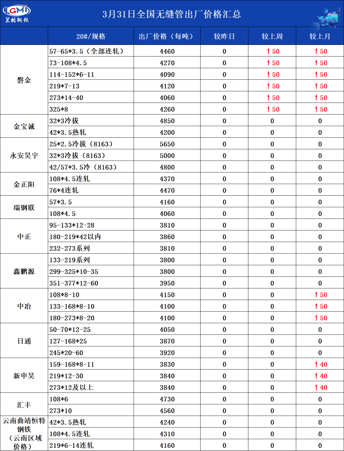 3月31日全国无缝管出厂价格汇总