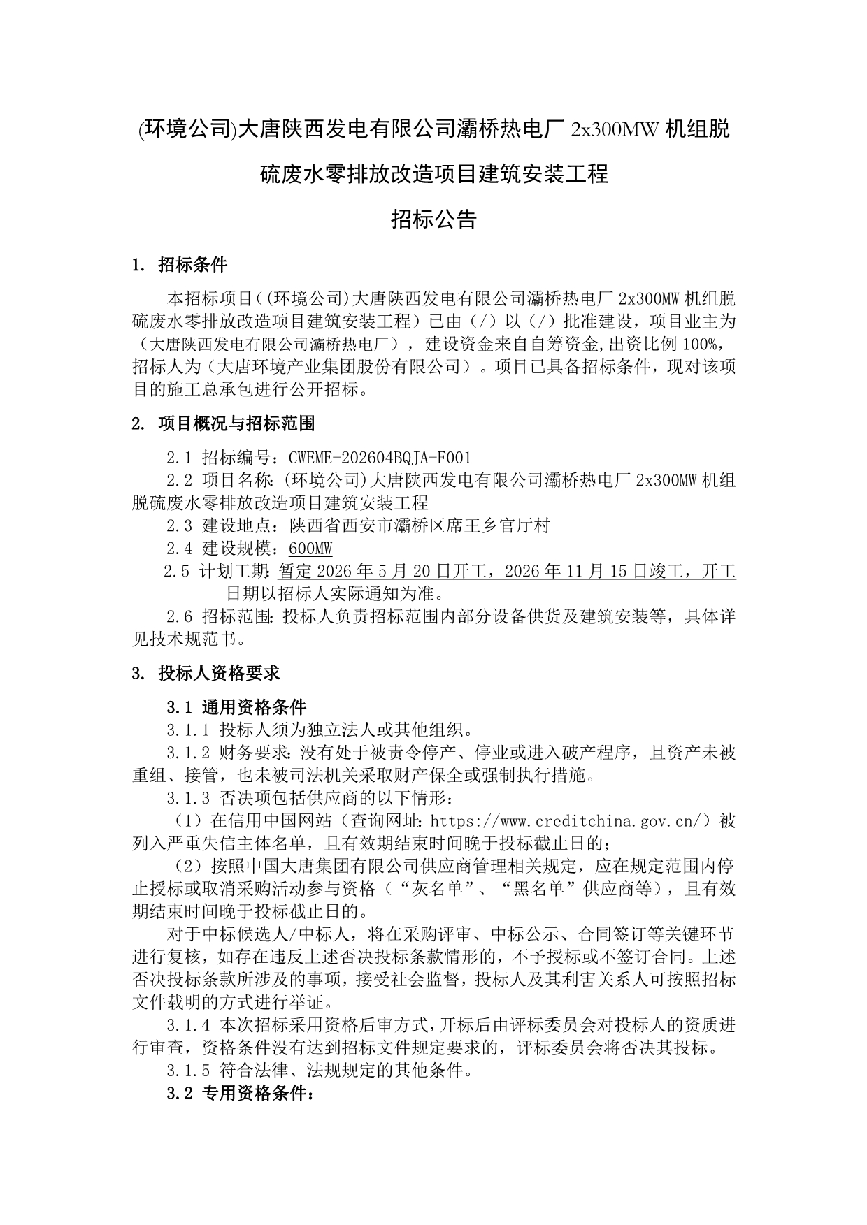 大唐灞桥热电厂2x300MW机组脱硫废水零排放改造项目建筑安装工程招标