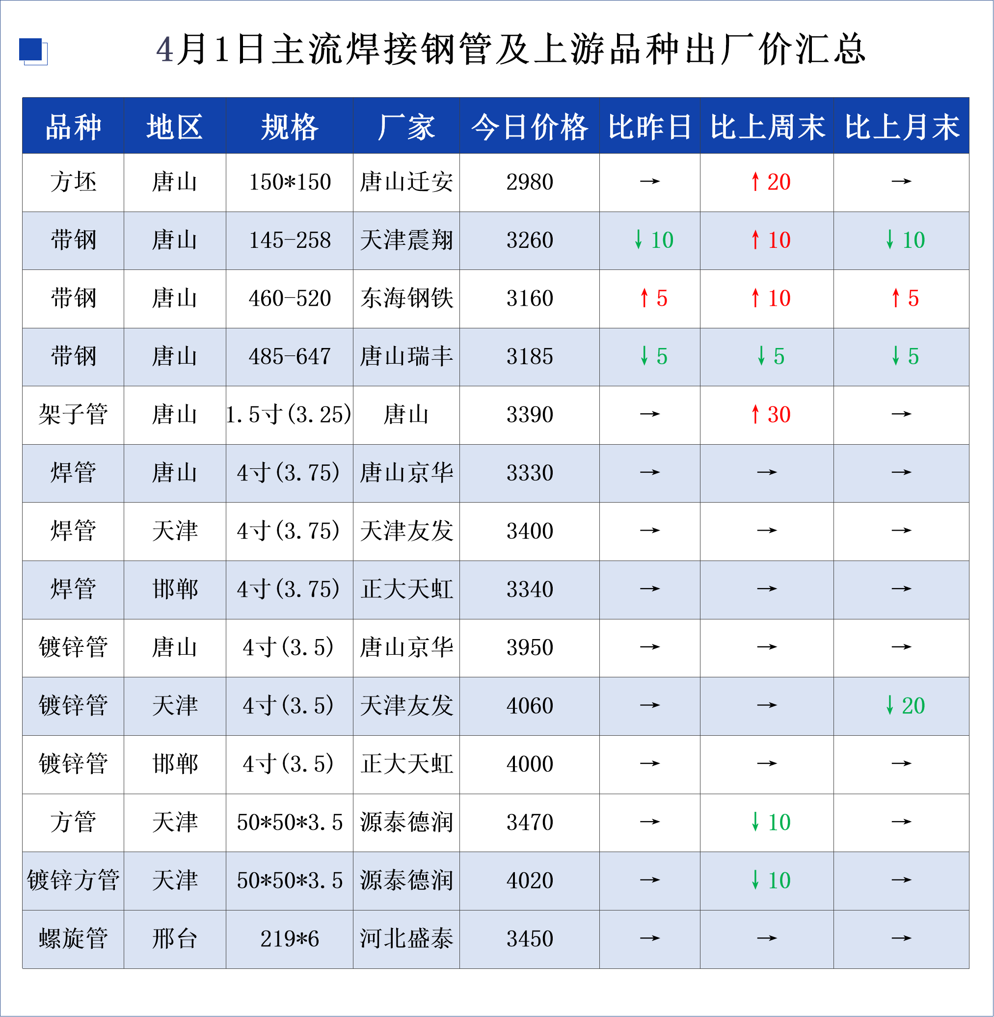 • 4月1日春节后主流焊接钢管及上游出厂价变动汇总