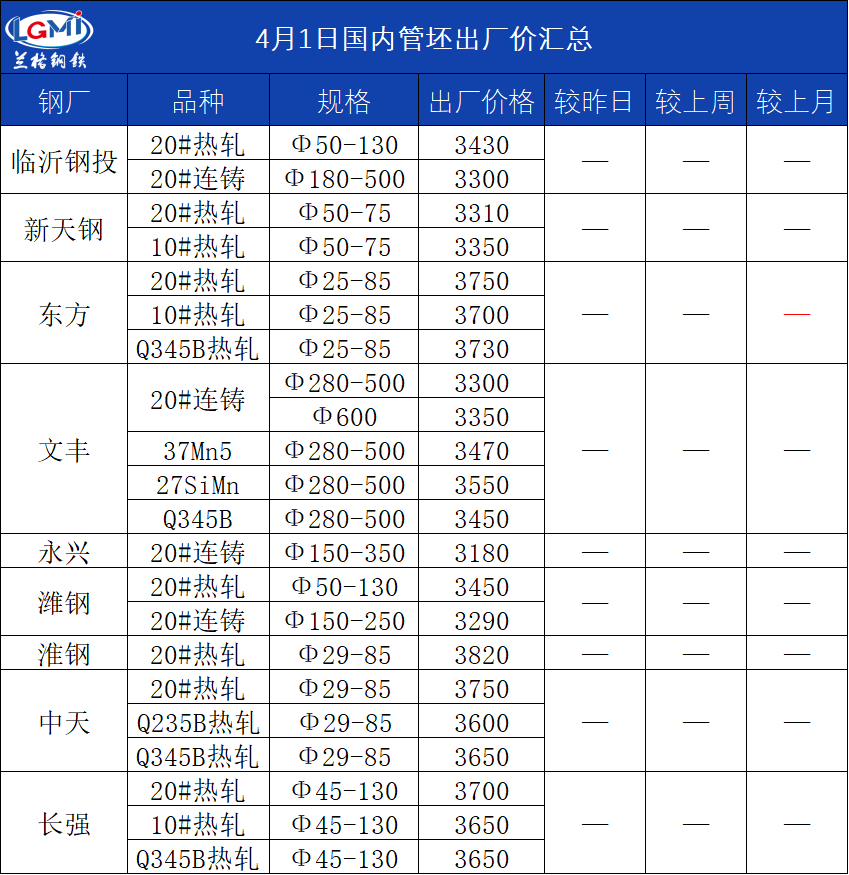 • 4月1日(11:00)主导钢厂20#热轧管坯出厂价