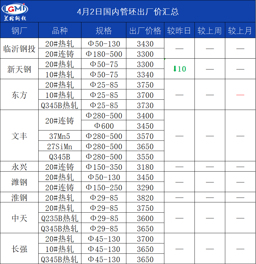 • 4月2日(11:00)主导钢厂20#热轧管坯出厂价