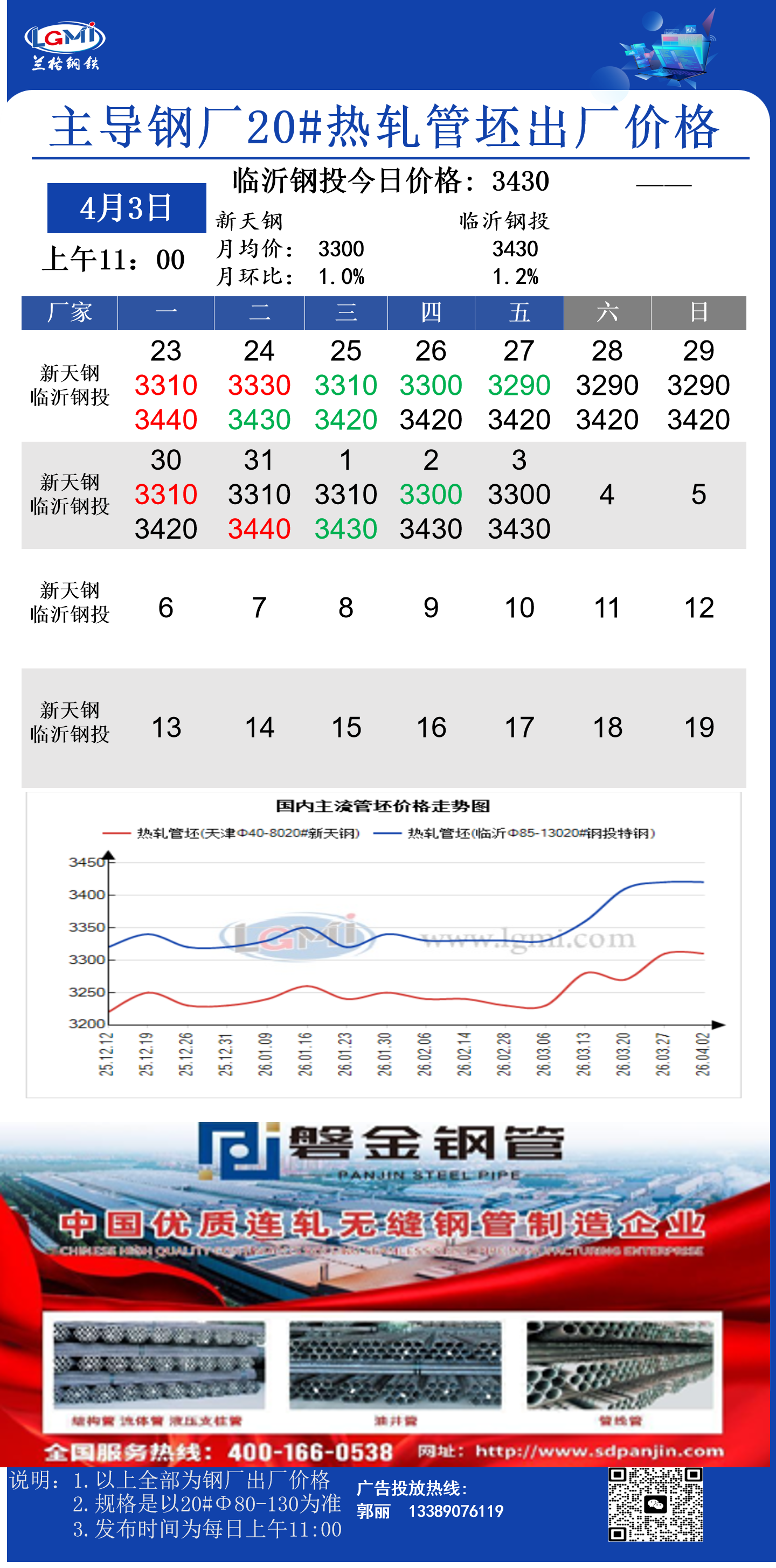 4月3日(11:00)主导钢厂20#热轧管坯出厂价