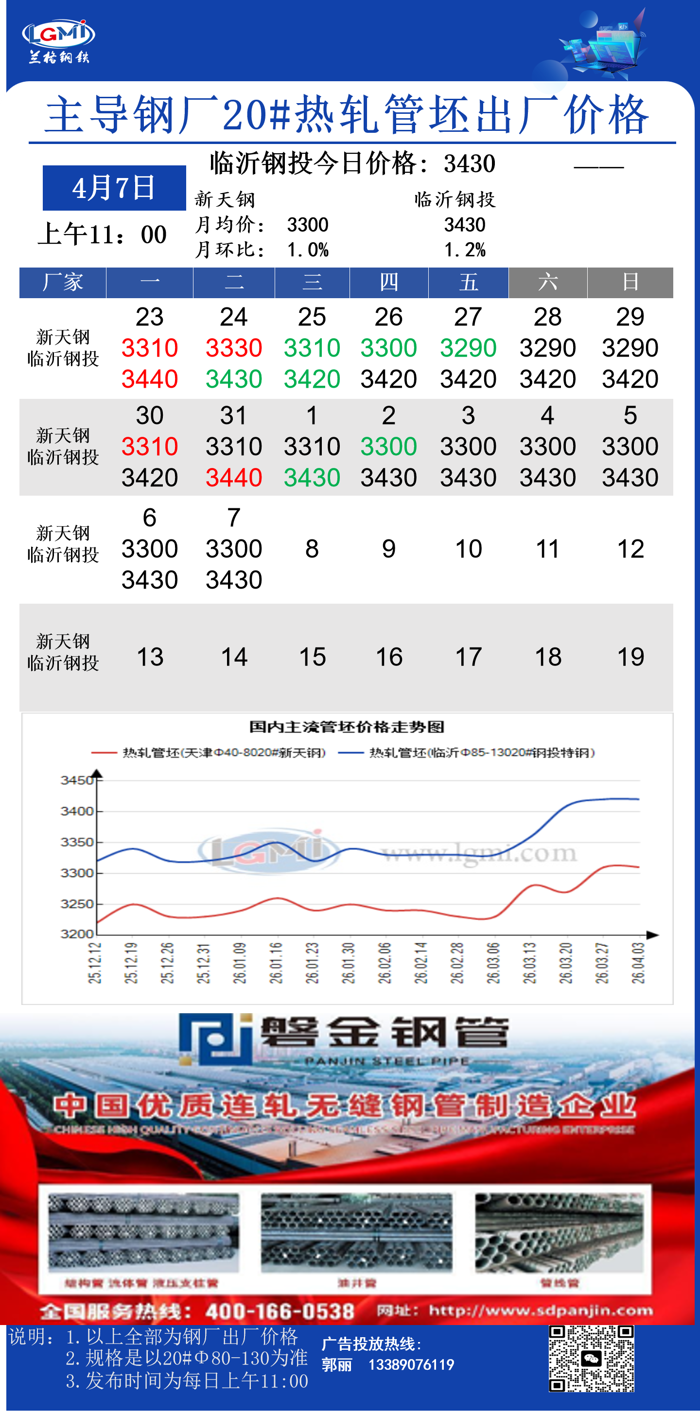 • 4月7日(11:00)主导钢厂20#热轧管坯出厂价