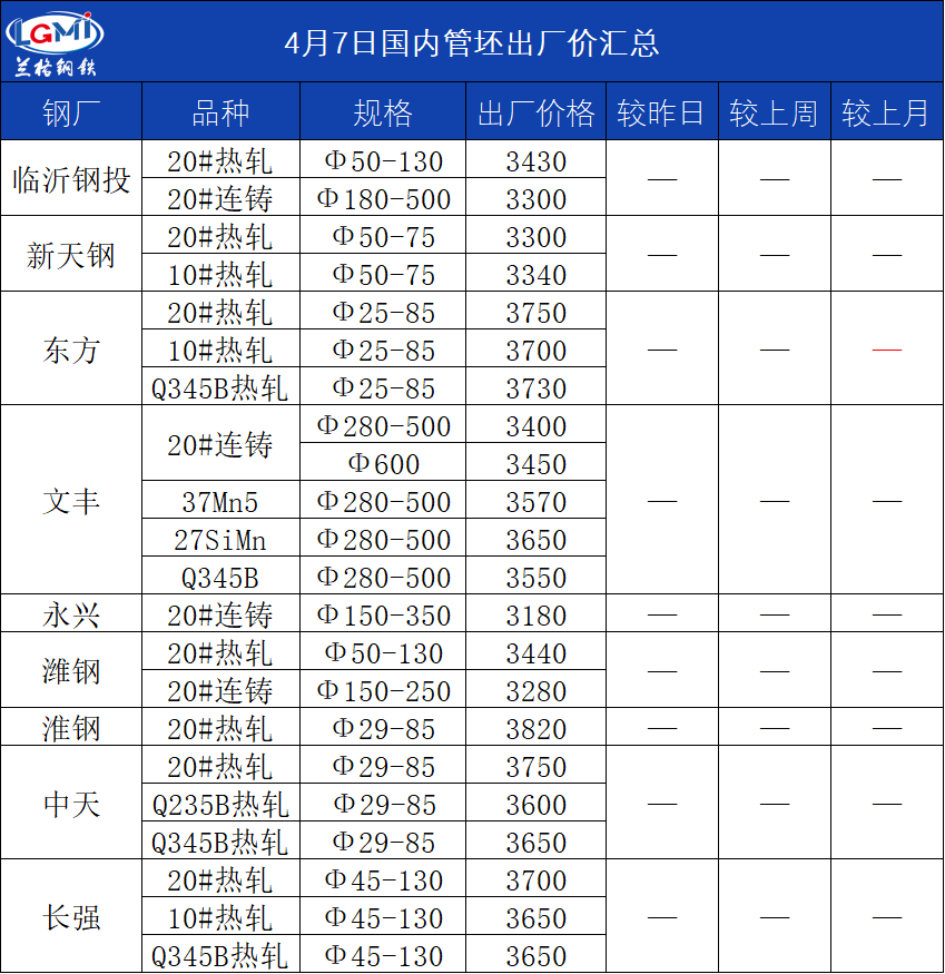 4月7日国内管坯出厂价汇总