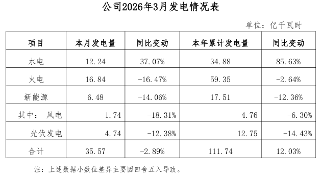 4月7日,湖北能源披露2026年3月发电情况。2026年3月,公司完成发电量35.57亿千瓦时,同比减少2.89%。其中水电发电量同比增加37.07%,火电发电量同比减少16.47%,新能源发电量同比减少14.06%。
