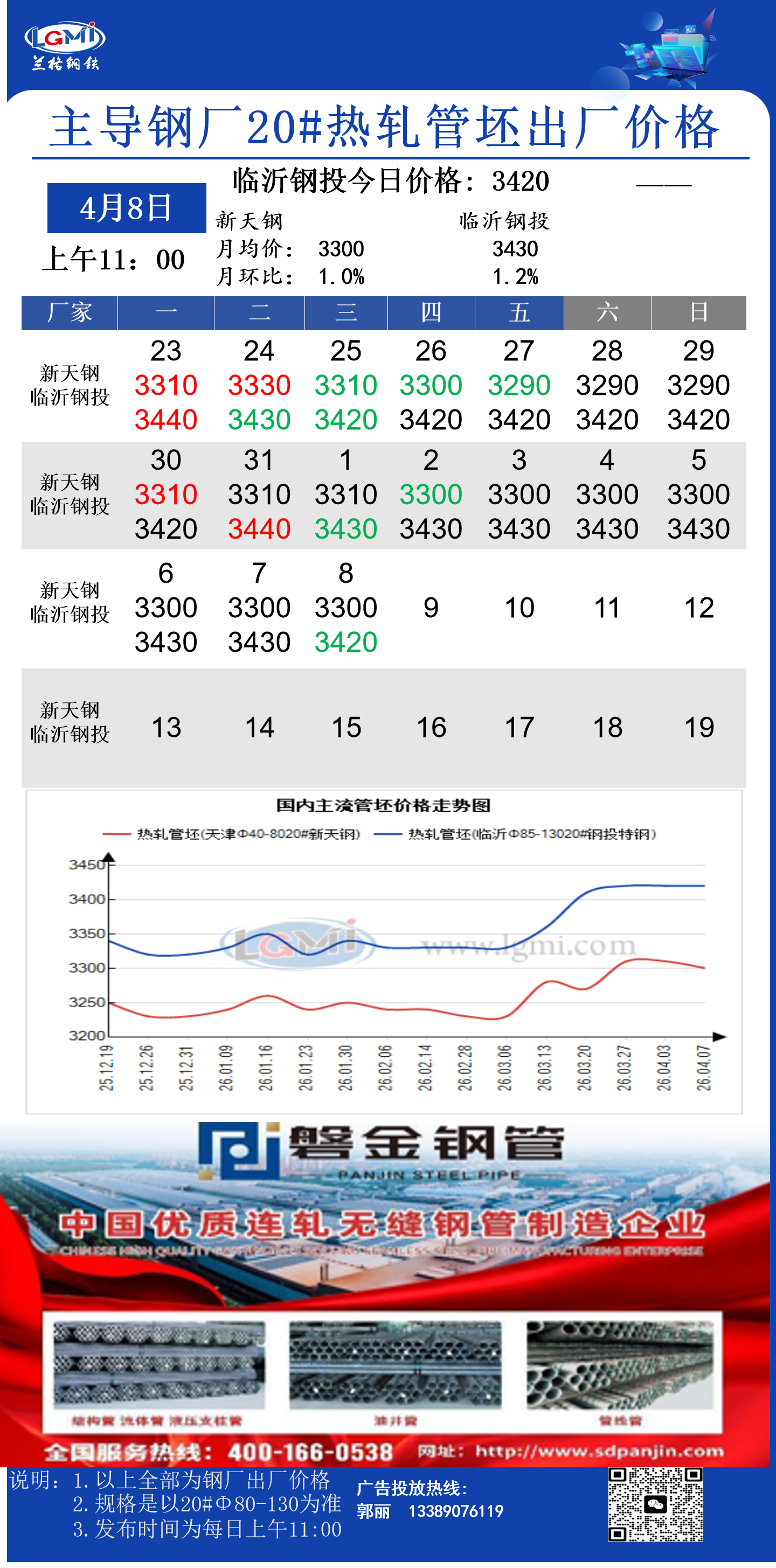 • 4月8日(11:00)主导钢厂20#热轧管坯出厂价