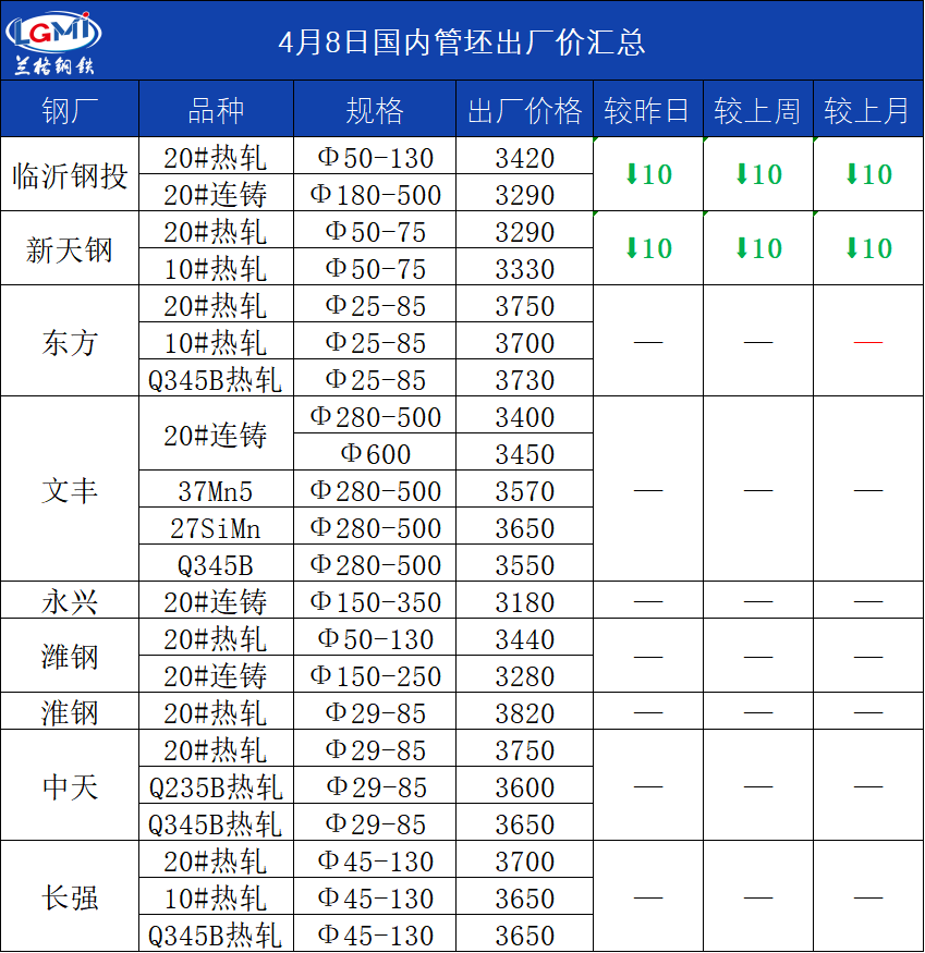 • 4月8日国内管坯出厂价汇总