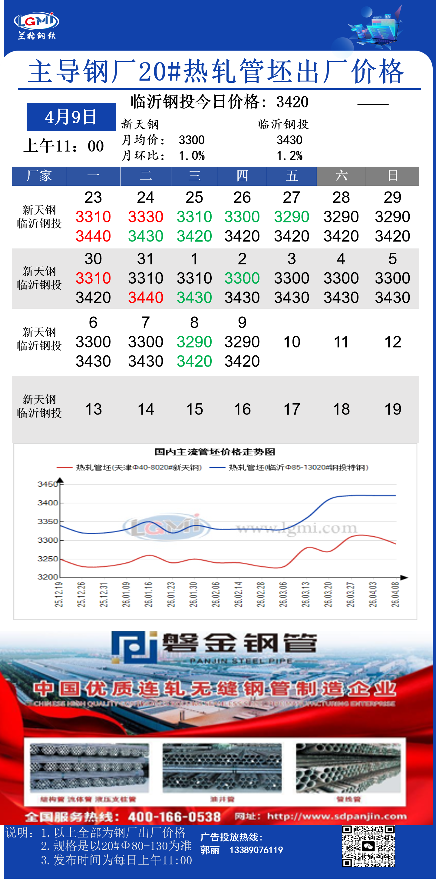 • 4月9日(11:00)主导钢厂20#热轧管坯出厂价