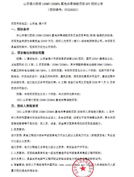 100MW/200MWh 山东德州氢电共享储能项目EPC招标