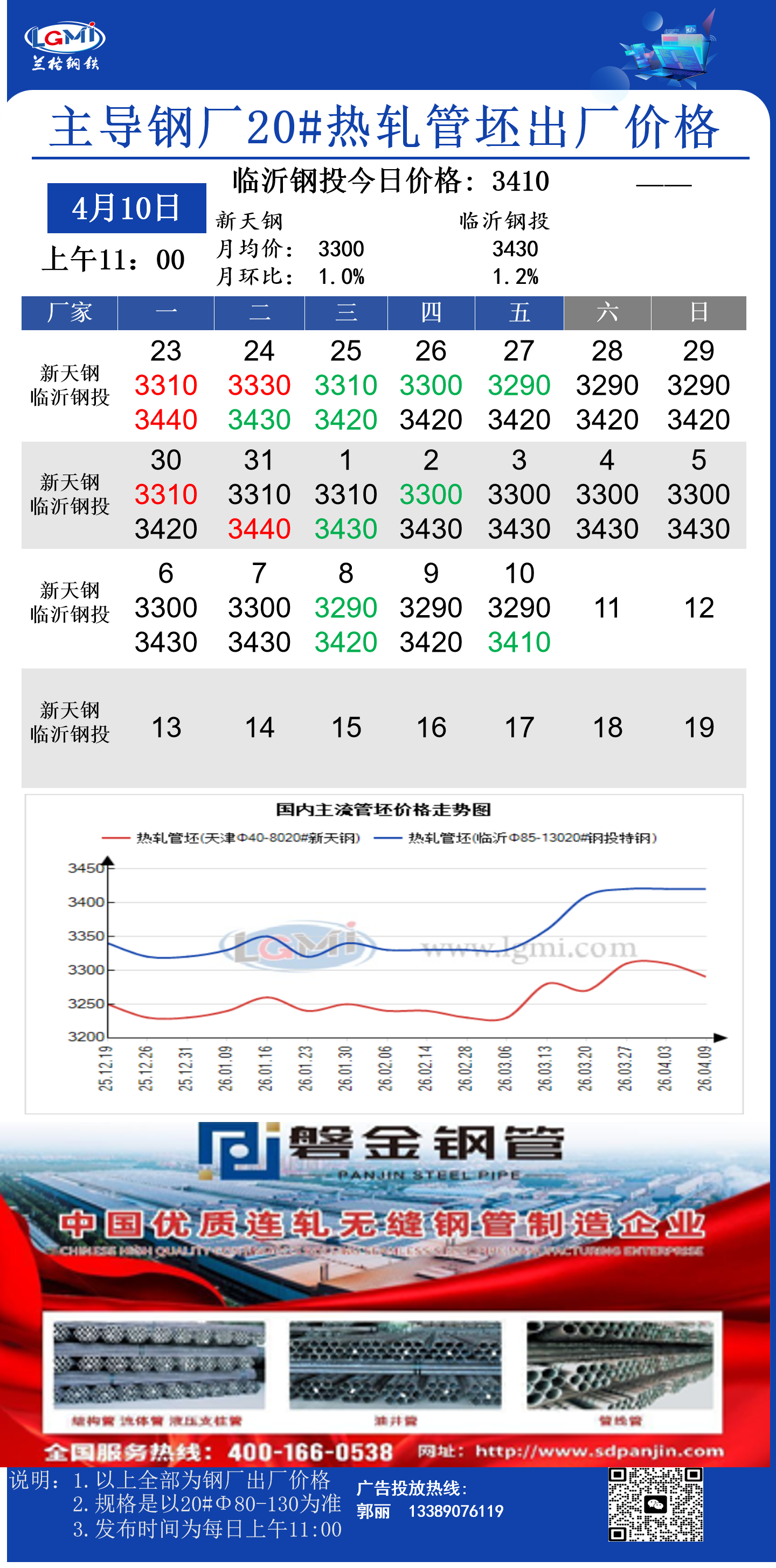 4月10日(11:00)主导钢厂20#热轧管坯出厂价