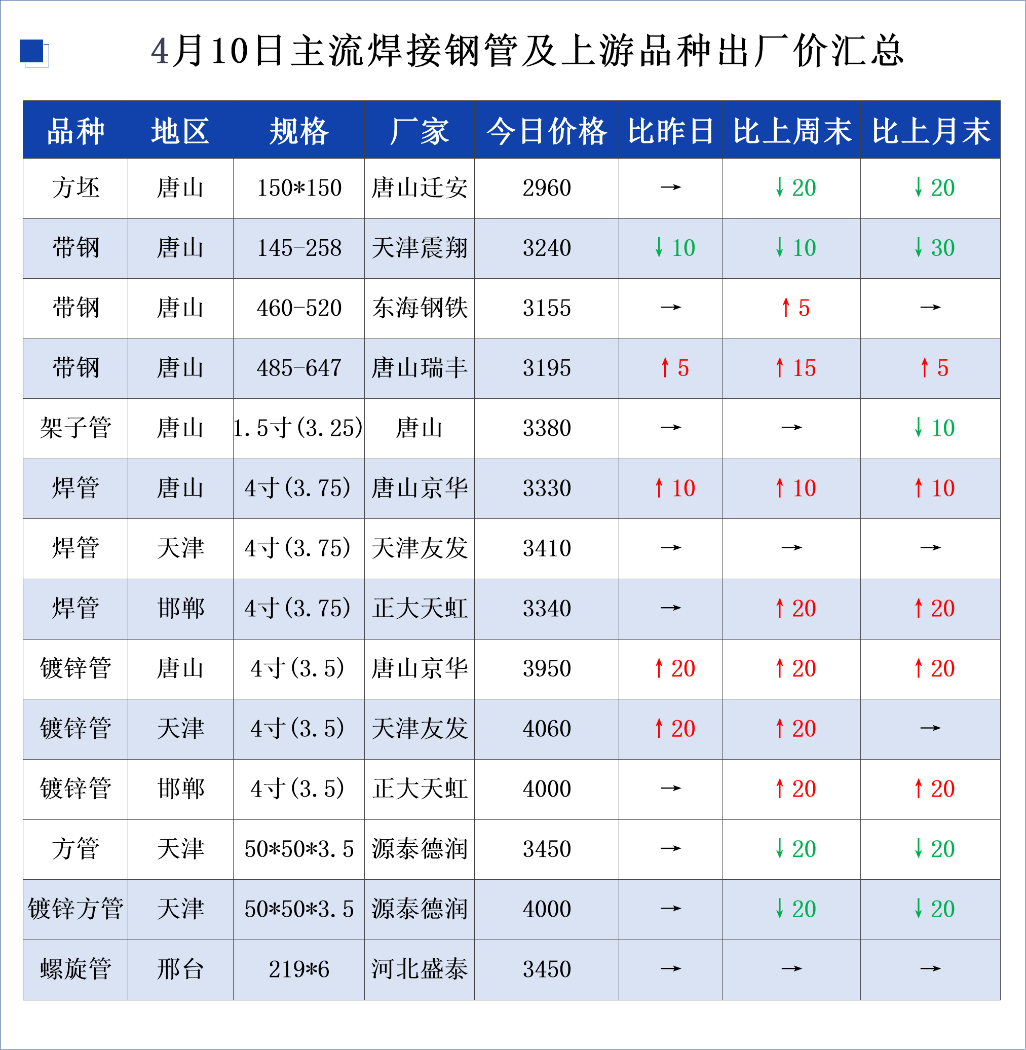 • 4月10日主流焊接钢管及上游出厂价变动汇总