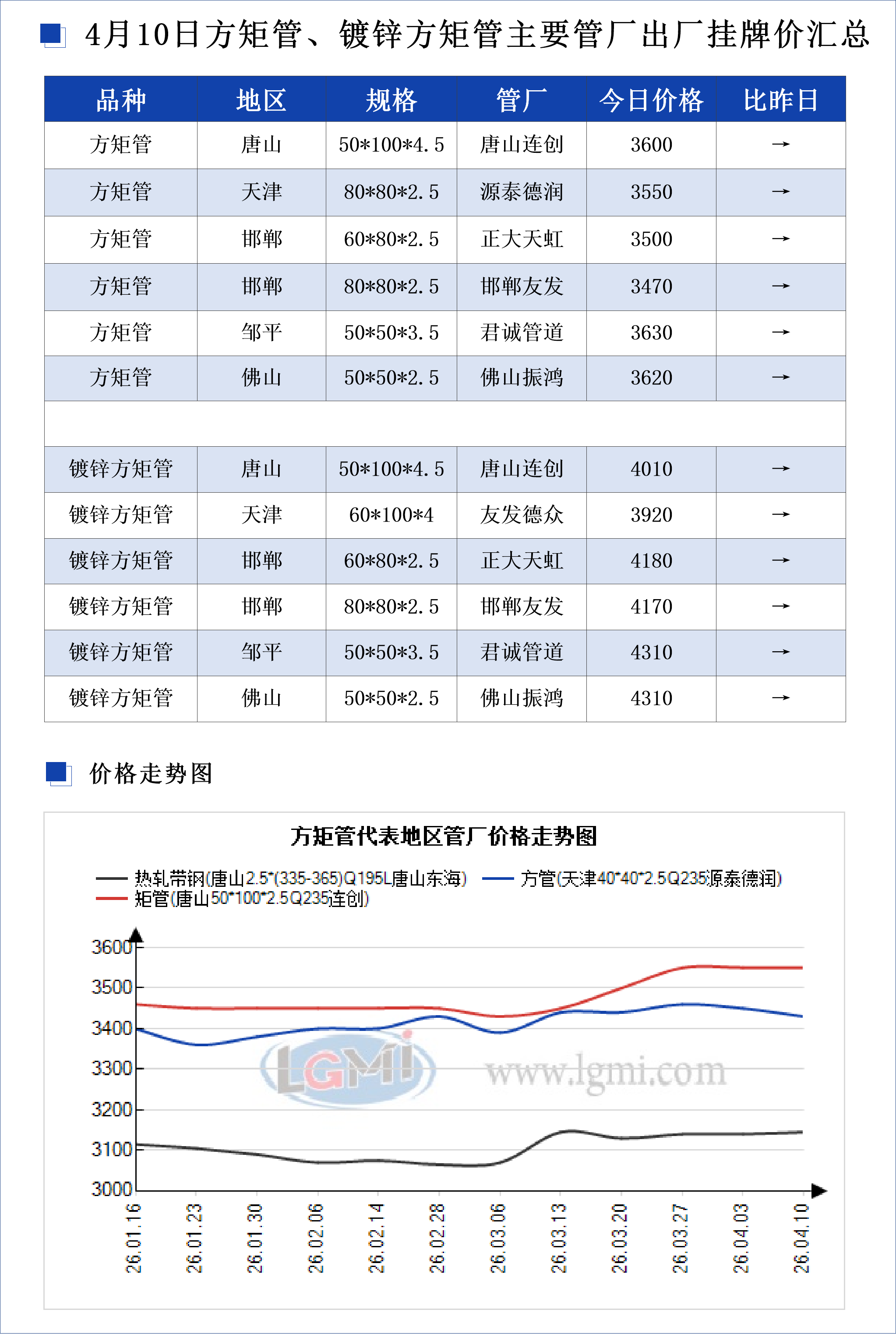 • 4月10日方矩管、镀锌方矩管主要管厂出厂挂牌价汇总
