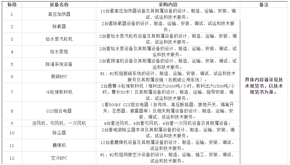 标段包1(高压加热器)、标段包2(除氧器)、标段包3(给水泵汽轮机)、标段包4(给水泵组)、标段包5(除渣系统设备)、标段包6(脱硫EPC)、标段包7(斗轮堆取料机)、标段包8(GIS全封闭组合电器)、标段包9(送风机、引风机、一次风机)、标段包10(除尘器)、标段包11(磨煤机)、标段包12(空冷EPC)。