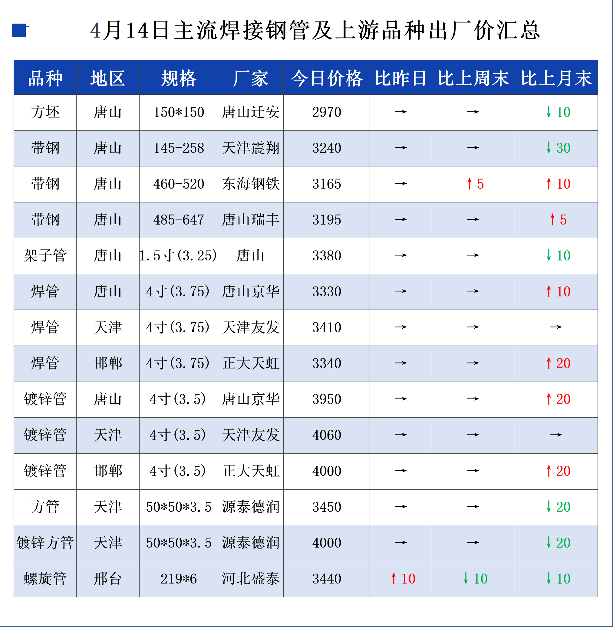 • 4月14日主流焊接钢管及上游出厂价变动汇总