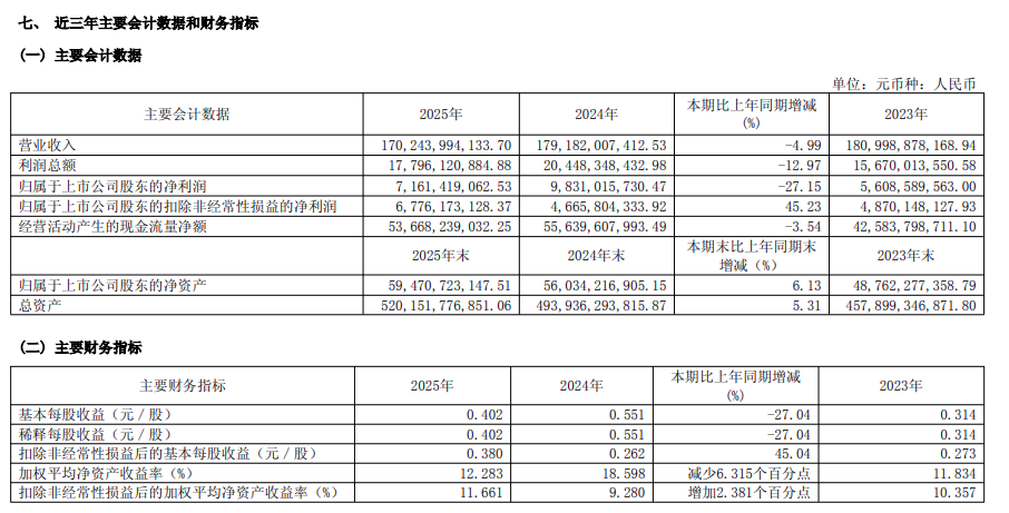 国电电力4月14日发布2025年年度报告。2025年,国电电力实现营业收入1702.44亿元,同比下降4.99%;实现净利润71.61亿元,其中火电板块44.00亿元,水电板块16.27亿元,风电及光伏板块15.62亿元,受上年同期转让国电建投50%股权投资收益增加基数较高影响,净利润同比下降27.15%。基本每股收益0.402元/股,比上年同期减少27.04%。