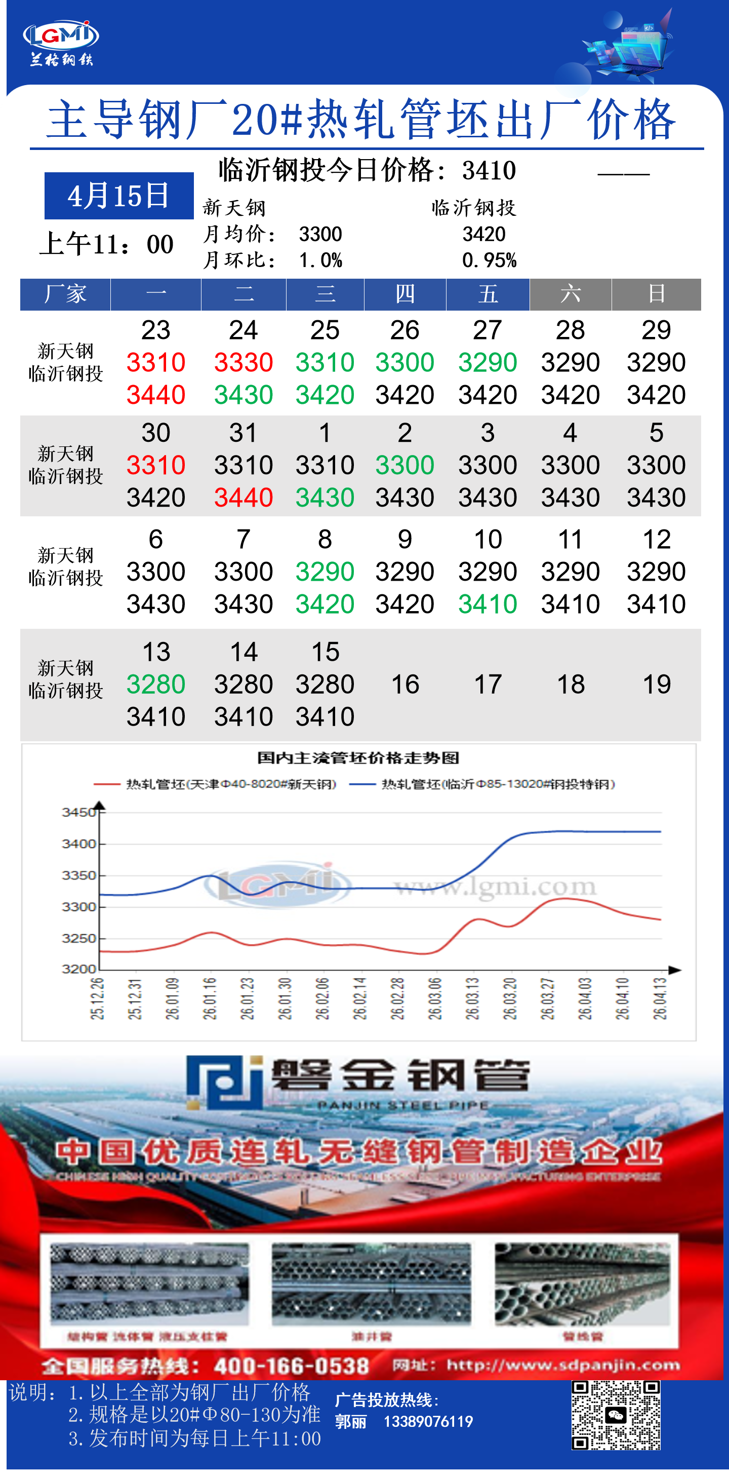 4月15日(11:00)主导钢厂20#热轧管坯出厂价