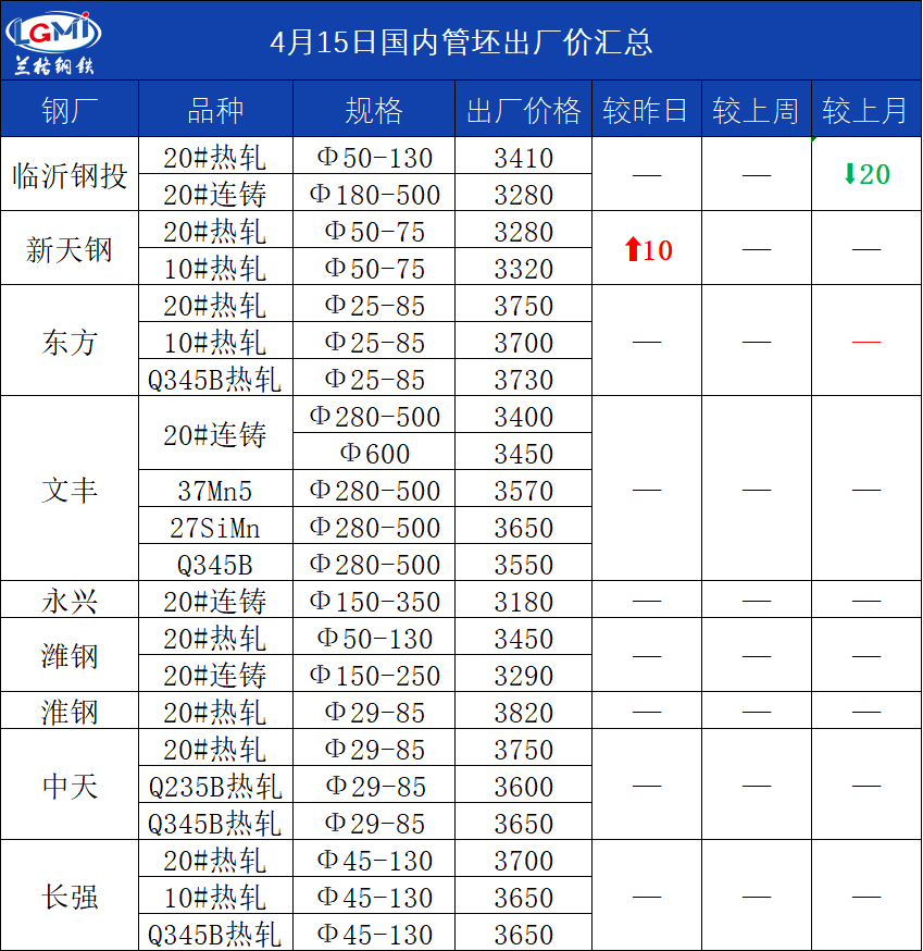 • 4月15日(11:00)主导钢厂20#热轧管坯出厂价