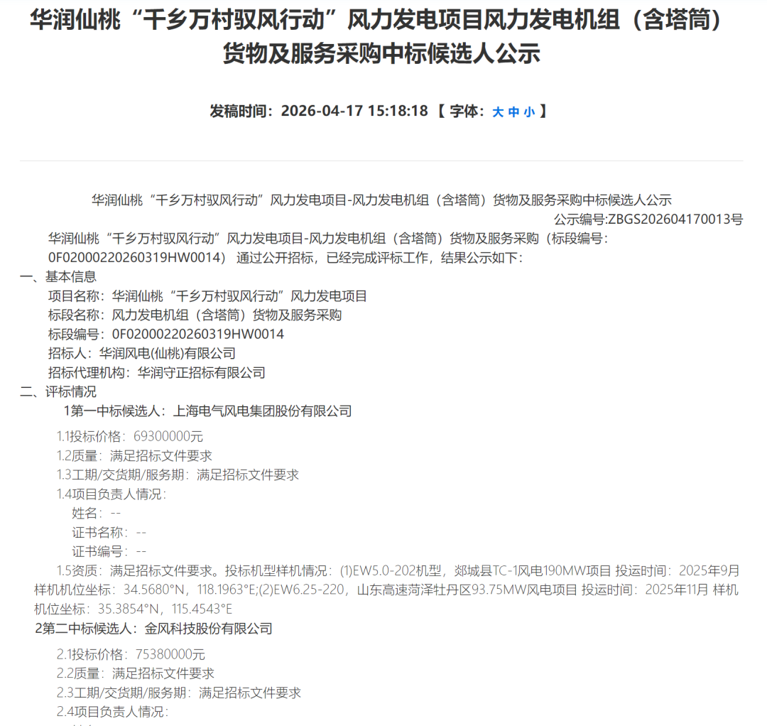4月17日,华润仙桃“千乡万村驭风行动”风力发电项目风力发电机组(含塔筒)货物及服务采购公示中标候选,项目规模30MW。