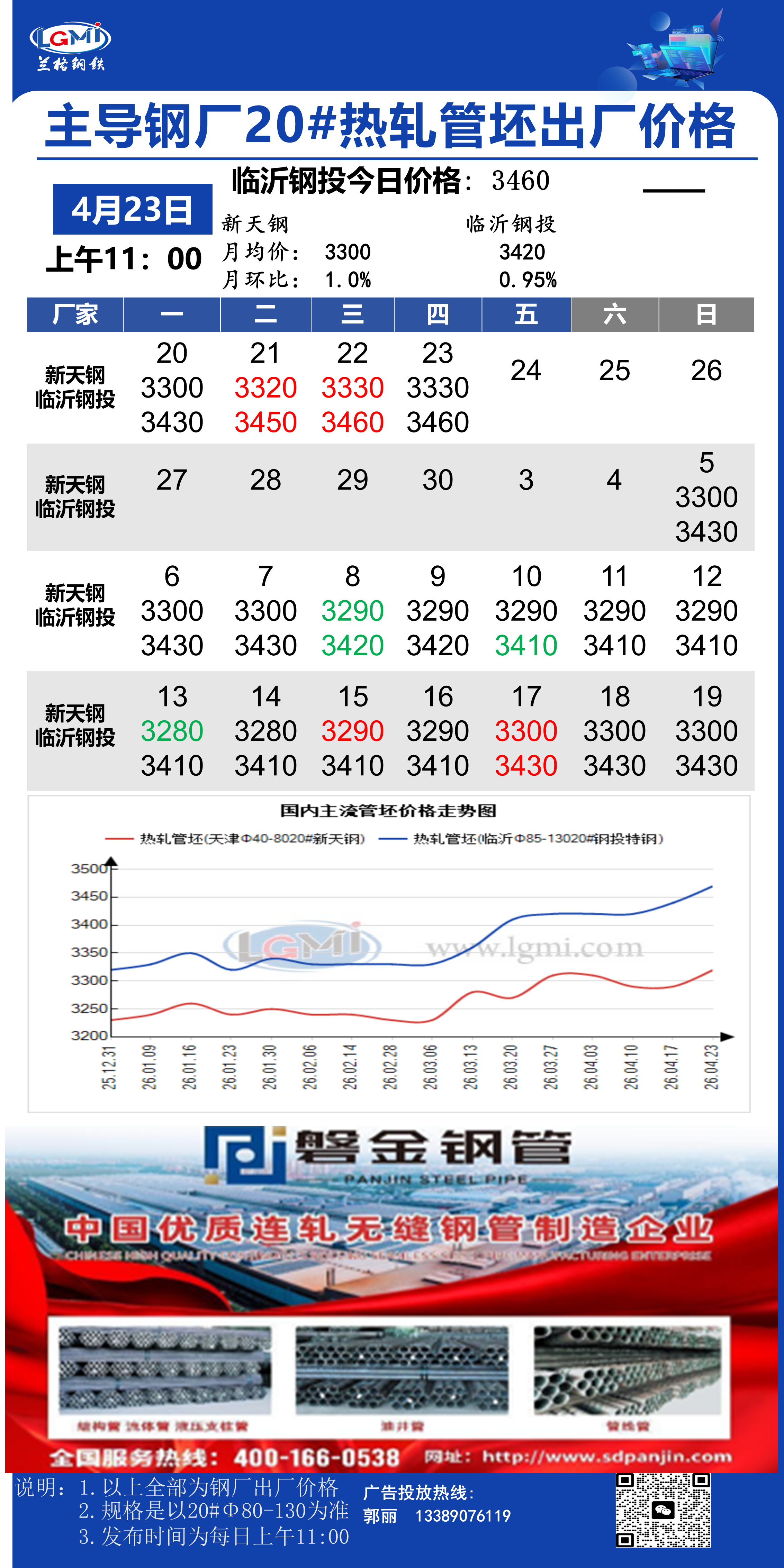 • 4月23日(11:00)主导钢厂20#热轧管坯出厂价