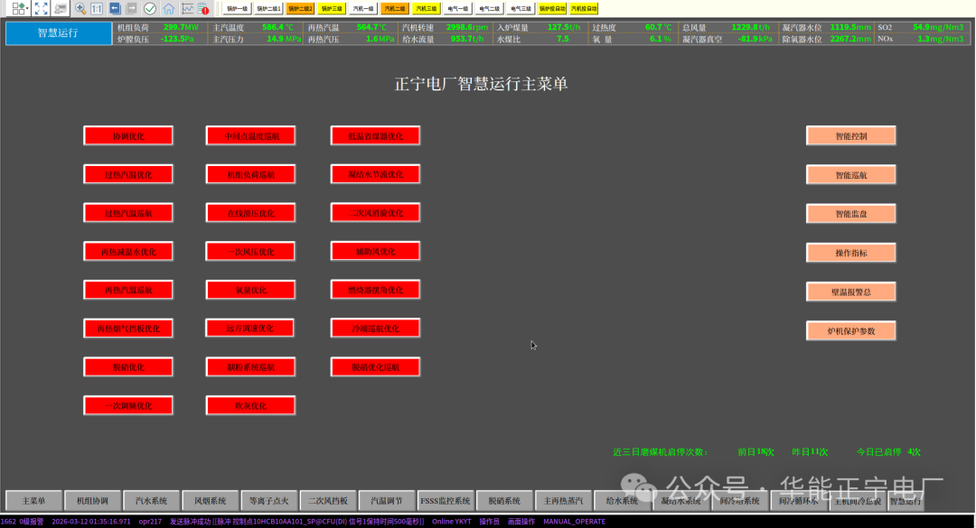 对此,中国华能联合产业链上下游开展智能控制系统技术攻关,以“无人干预”为目标,通过突破超融合智能控制、多模态数据深度挖掘、全过程高精度建模、轻量化边缘云与云边协同四大核心技术,落地22项智慧运行功能,为煤电机组装上“智能大脑”,成功实现百万千瓦等级煤电机组30%~100%负荷范围内机组运行自动巡航、参数调节,以及设备启停的全程无人干预自主控制,系统自主决策最优运行模式,主动调节控制策略和控制参数,实现了堵磨、断煤、超温等20余类故障异常的自主识别和消除,大幅降低了人工操作强度与运行风险。正宁电厂1号机组测试运行期间AGC性能大幅提高,一次调频考核全面达标。
