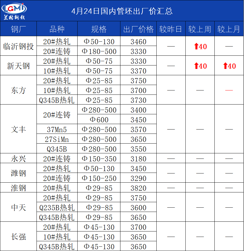 • 4月24日(11:00)主导钢厂20#热轧管坯出厂价
