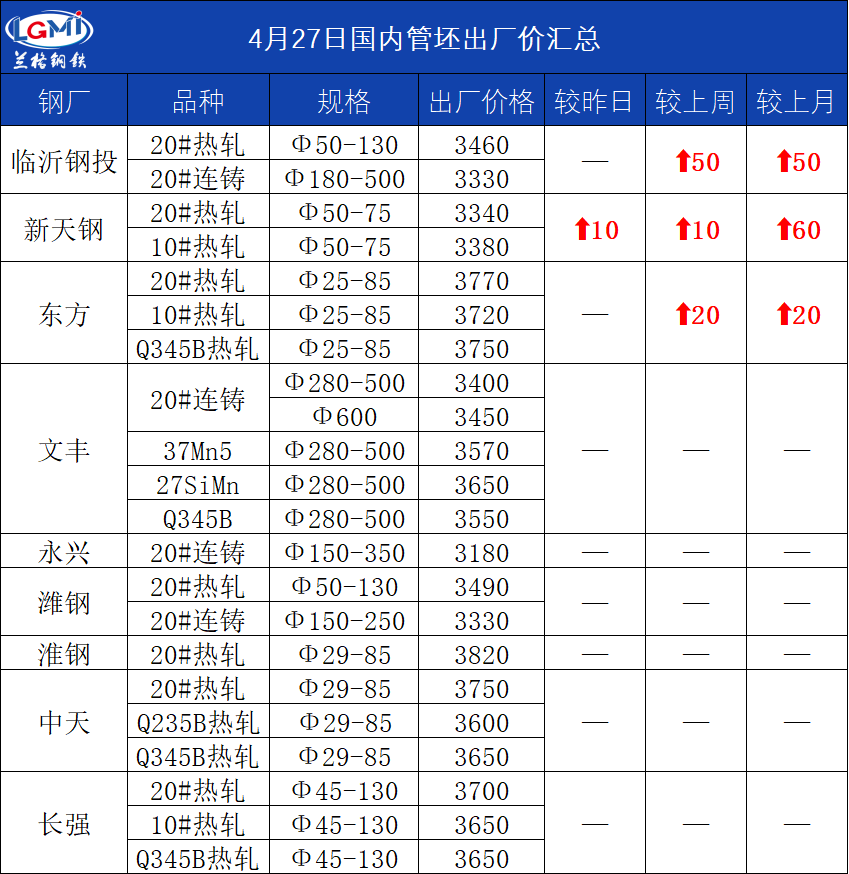 • 4月27日(11:00)主导钢厂20#热轧管坯出厂价