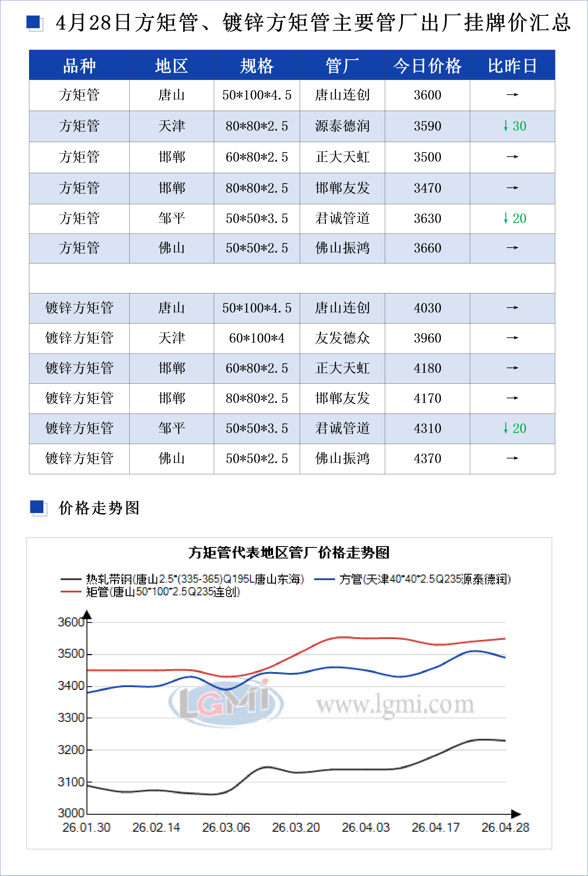 • 4月28日方矩管、镀锌方矩管主要管厂出厂挂牌价汇总