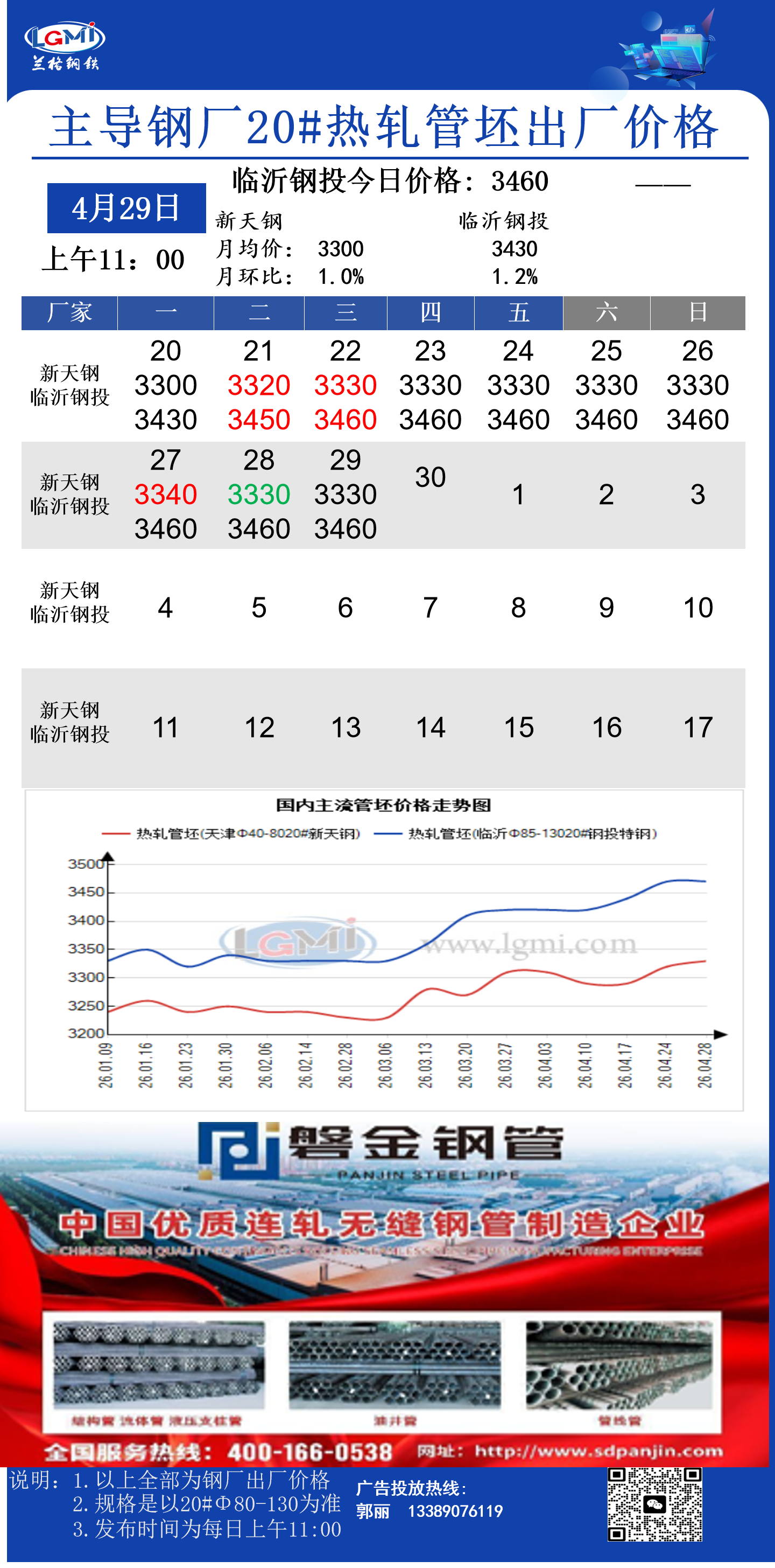 4月29日(11:00)主导钢厂20#热轧管坯出厂价