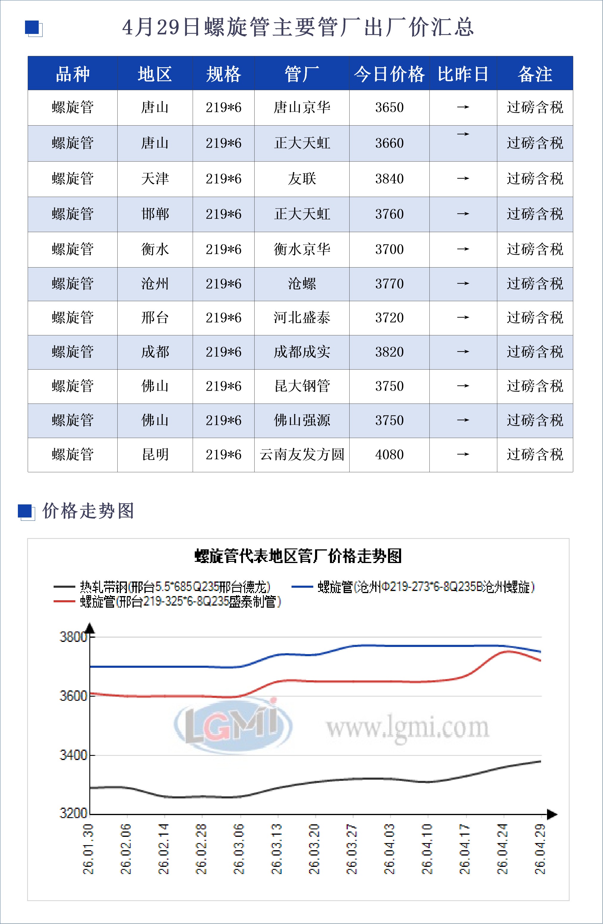 • 4月29日螺旋管主要地区管厂出厂价汇总